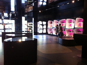 Premium Dutch footwear retailer, ShoeBaloo turned that practice on its head when they selected a huge 375sqm sized space back in 2006 for their Rotterdam store. To put that in perspective it’s up to four times the size of your average boutique shoe store. A vast hall of mirrored ceiling and black flooring with mirrored topcoat reflects the walls – each lined with asymmetrical moulded alcoves wrapped in white leather. Ever-changing coloured light permeates through the translucent acrylic behind each alcove, providing a varying backdrop to highlight the footwear.